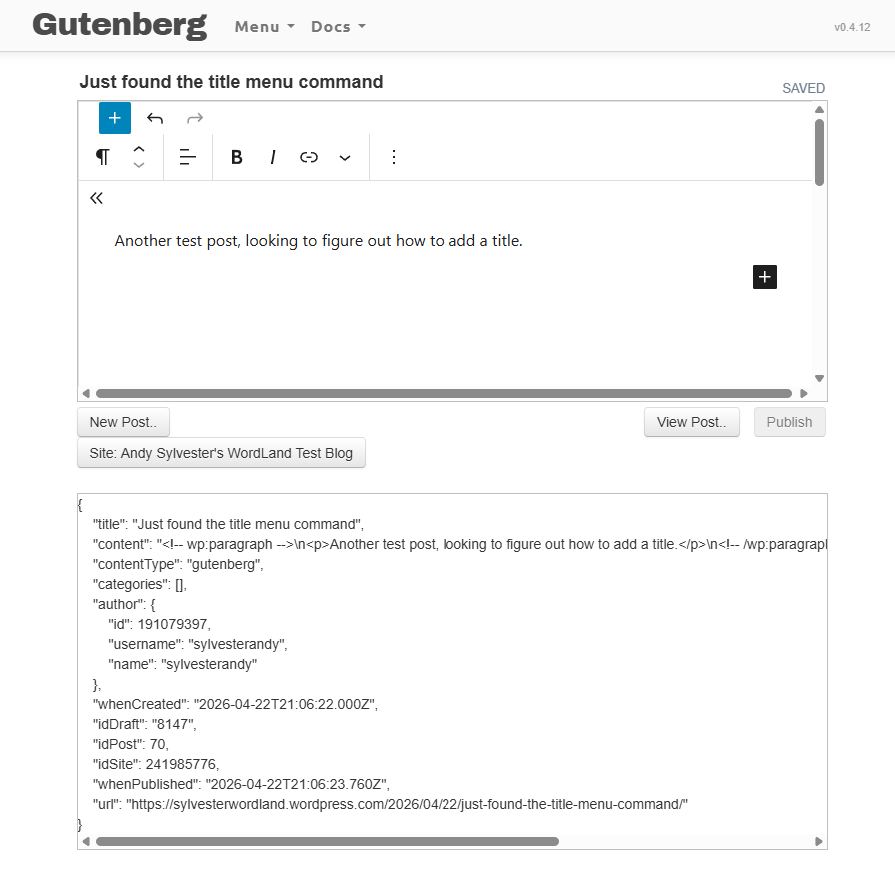 I was able to select my WordLand test blog as the location for my GutenbergLand post, and was able to post some text, then another post where I added a title. In WordLand, a title can be added to a post in the editor user interface, but in GutenbergLand, the title has to be added via a menu command.
